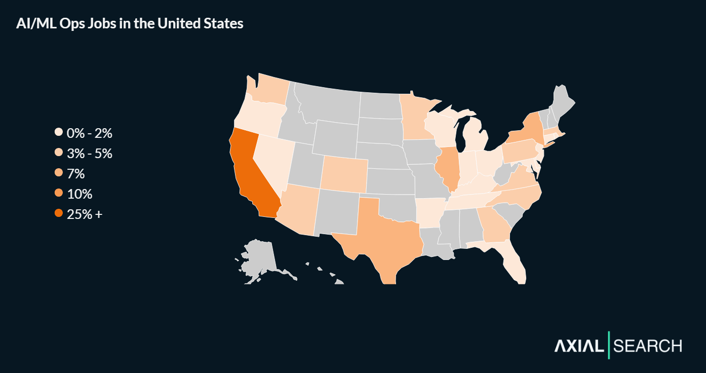 California dominates with 26% of all AI/ML Ops postings. New York follows at 8%, Illinois at 7%, Texas at 7%, and Massachusetts rounds out the top five at 5%.